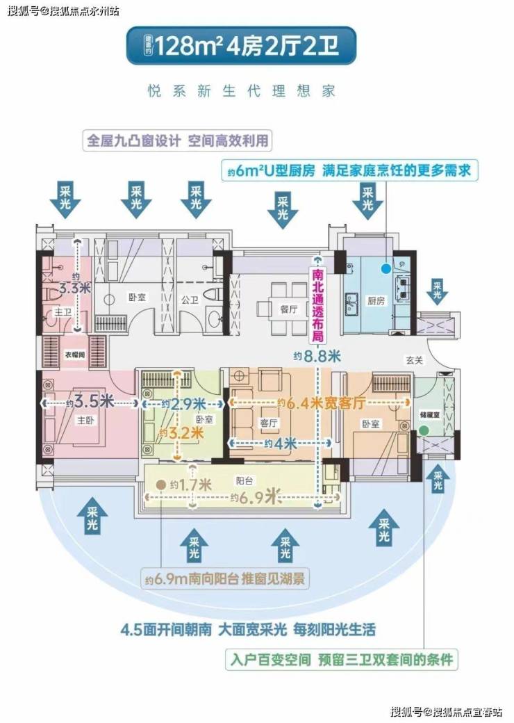 128㎡的4房2厅2卫:属于南北通透竖厅格局,客厅进深7.1米(不含阳台),开间4米,配有6.96米宽景阳台,主卧套间设计,配有衣帽间和三段式卫生间。这个户型除通透性比传统横厅更优异外,静区部分的静溢性也会比较好,居住舒适性更佳,受众也是老少皆宜。