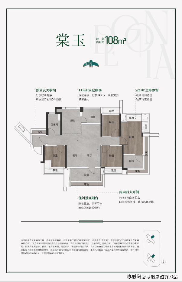建面约108㎡ 4空间2厅2卫,项目放在了东南单边位,而且是南北对流设计,保证了采光通风,在市场同面积段产品里比较少见,所有房间都有花池、飘窗赠送,空间感应该不小,像主卧还能放下衣帽间,估计整个户型实际能去到120㎡左右,进门处带了入户花园,可以用来收纳之余,也多了一份仪式感。