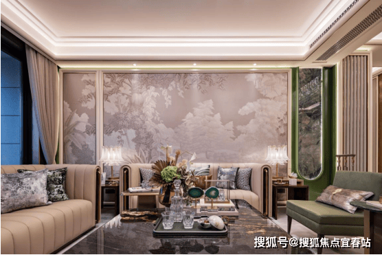 客厅背景墙为阿玛尼底材刺绣墙艺,营造清雅美学。