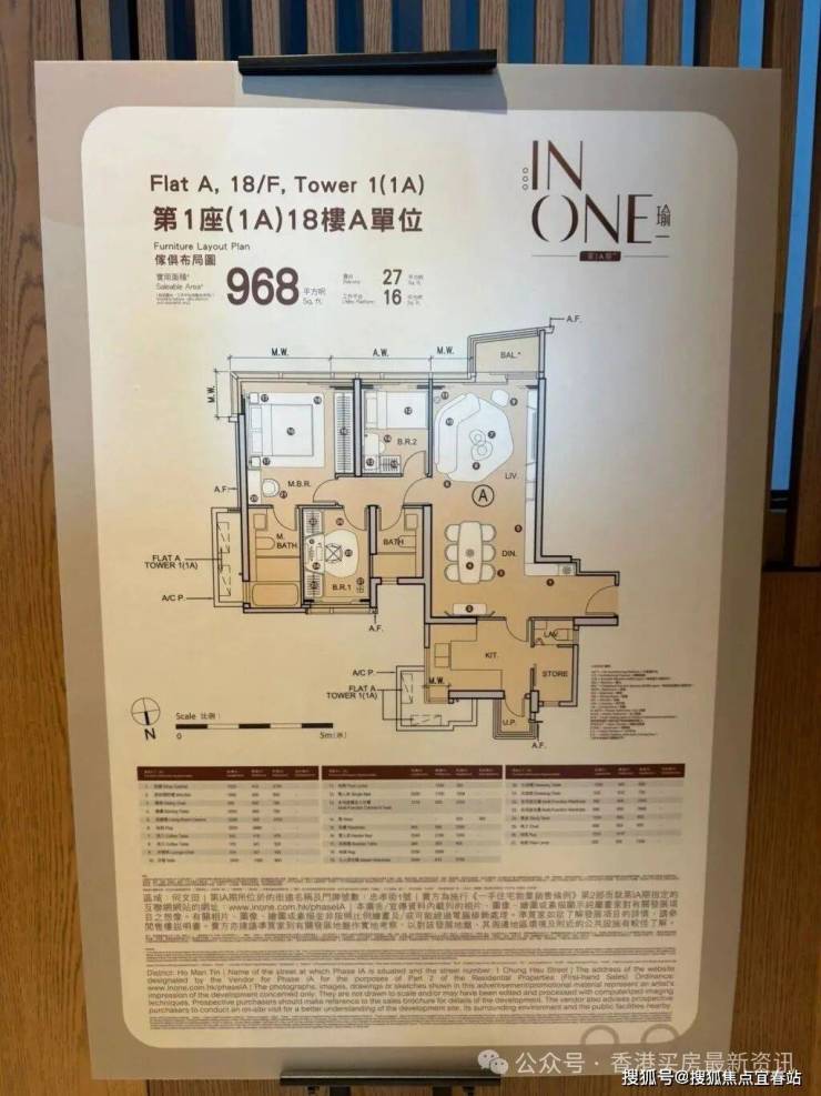 瑜一·天海1A座18楼A室,3房实用面积968方呎。客饭厅以长形开则,间隔宽敞实用,长约 7.2 米、阔约 3.25 米,层与层之间的高度约 3.225 米,连接约 27 平方呎阳台,配以落地玻璃趟门,可享开扬维港海景。
