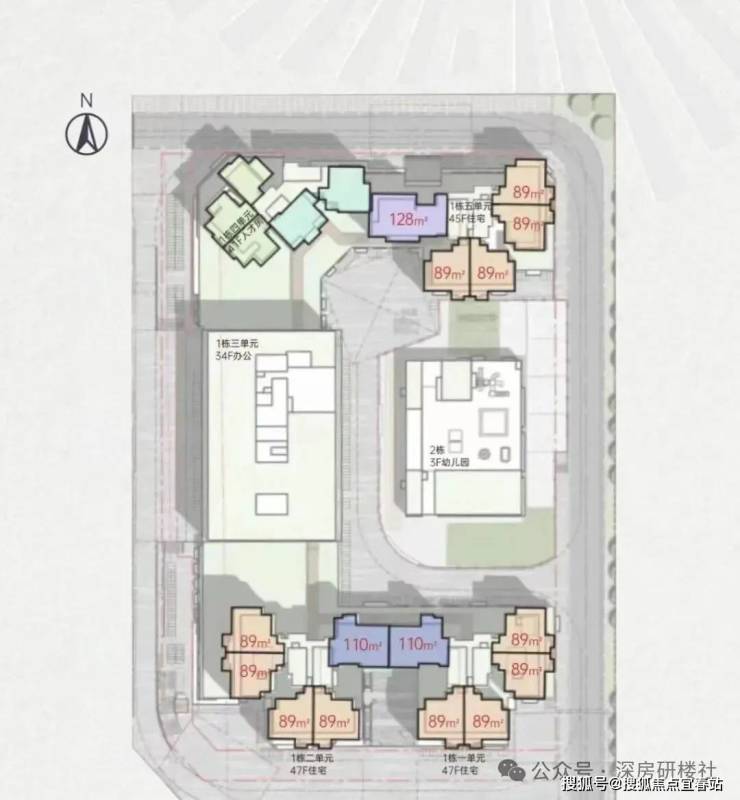 从平面图可以看出住宅均为每层5户的布局,1栋1、2单元为47层住宅,1栋5单元为45层住宅,1栋4单元为41层人才房,1栋3单元为34层写字楼,2栋为3层幼儿园。