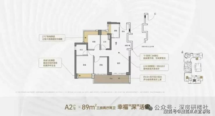 89㎡的3房2厅2卫,A2户型,设计的是竖厅格局,客厅3.5米开间,LDKB一体化,S墙设计预留冰箱卡槽位,客厅连接次卧出5.9米长的大阳台,次卧270度转角飘窗,U型厨房,卫生间干湿分离,阳台有朝西向、东向、南向。