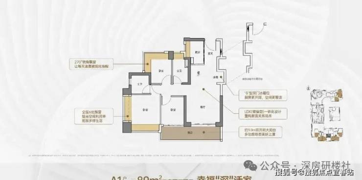 89㎡的3房2厅2卫,A1户型,设计的是竖厅格局,客厅3.5米开间,LDKB一体化,S墙设计预留冰箱卡槽位,客厅连接次卧出5.9米长的大阳台,主卧双面飘窗,次卧270度转角飘窗,U型厨房,卫生间干湿分离,阳台有朝西向、东向、南向。