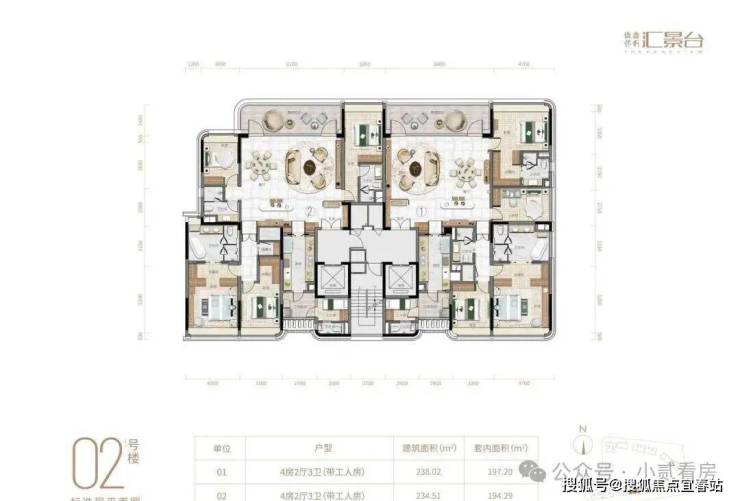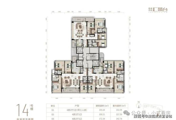 项目由14栋12层小高层组成,产品涵盖123-352㎡三至五房,共8类户型,户型实用率约82-84%
