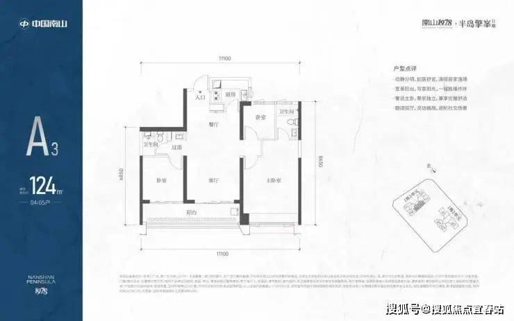 A3也是两条腿,分别是1-1栋04/05,主朝向是东南向,双龙抱珠格局。客厅拥有超大观景阳台,缺点是公卫是个暗卫,小次卧和主卫也对天井外走廊,采光不足。