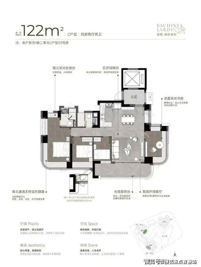 双龙抱珠户型,书房分布于客厅另一侧,且难得是双面采光+270°景观视野。主卧南北通透,且拥有十分开阔的景观面。贯通式阳台联通客厅以及靠近动区的次卧,实现长观景阳台。