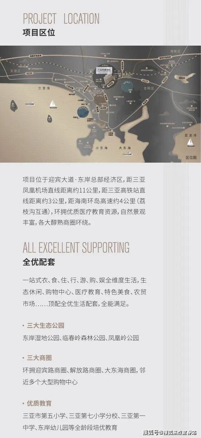 项目位于迎宾大道·东岸总部经济区,距三亚凤凰机场直线距离约11公里,距三亚高铁站直线距离约3公里,距海南环岛高速约4公里(荔枝沟互通),环拥优质医疗教育资源,自然景观丰富,各大醇熟商圈环绕。