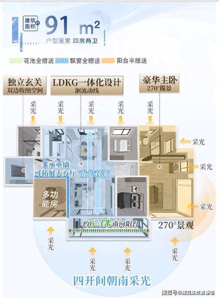 最高约120%使用率,约6.3米南向阳台, 豪华主卧套房+270°环幕全景窗,尺度堪比120平以上的大户型