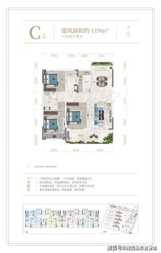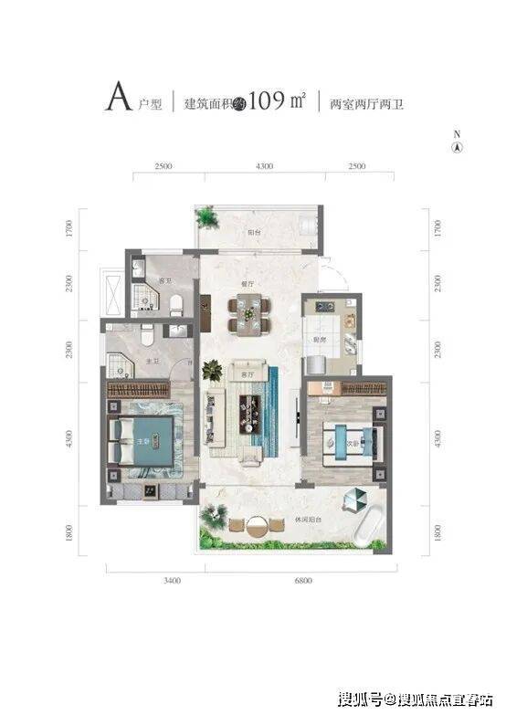 【优居户型】 海棠壹号院全新迭代建筑面积约109-119㎡升级户型,空间布局科学合理,全明户型,南北双阳台,270°环幕视野,重新定义高端品质人居尺度。A 户型109㎡两室两厅两卫