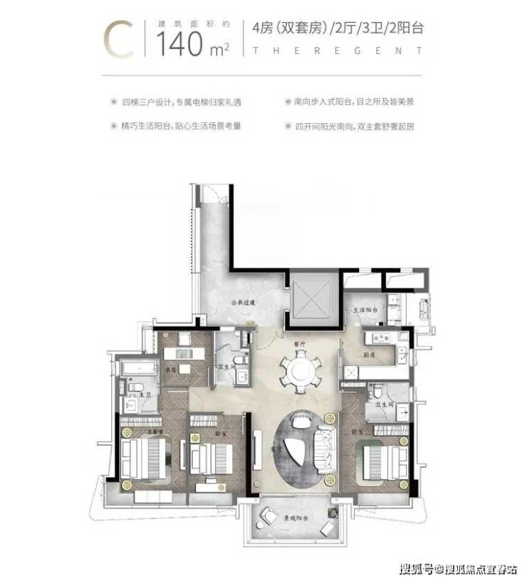 产品亮点:私家电梯入户、约3.4米层高、动静分区南北对流、约6.8米挑空餐客厅、中西双厨、三套房设计、部分房间带阳台设计