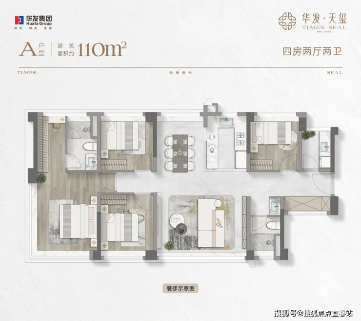 约110㎡四房两厅两卫:约16米通风面,户户是端户;约28㎡行政级端卧套房,270°景观视野,360°环统式采光