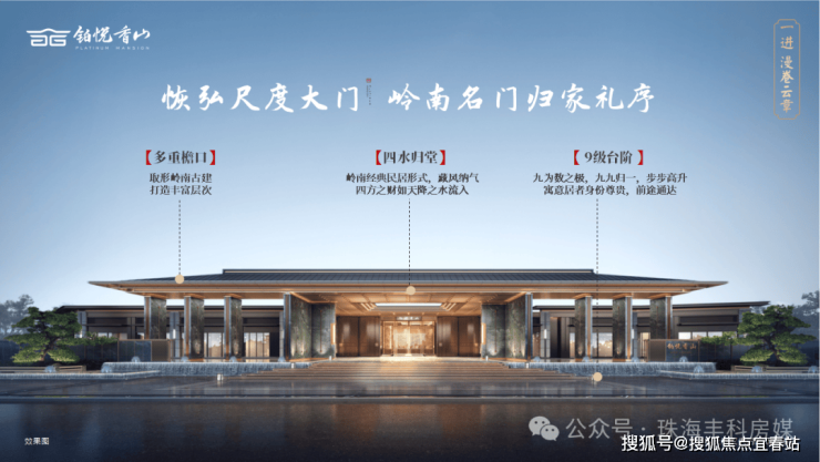 圈层纯粹,皆以大户型为主!项目由正方和兴格联手打造。因此在产品调性方面,继正方南湾首府、正方深悦湾之后,铂悦香山仍沿袭中式风格,以香山文脉为底蕴,打造当代岭南意境人居。项目营造多重归家进制,一进府门,二进金水澜庭,三进琉璃水院,从效果图来看,真的非常磅礴气派。