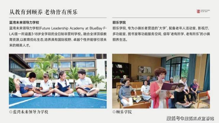 在教育板块,小镇实现 “全龄段教育需求覆盖”:针对青少年,引入蓝湾未来领导力学校,融合全球顶级教育资源,培养具有国际视野、卓越个性并能够引领未来的精英人才,以优质教育优化社区生态。针对小镇长者,打造颐乐学院这所“小镇里的大学”,配备老年人活动室、影视厅、多功能室、图书室等功能服务空间,倡导‘老有所学、老有所乐’的颐养生活理念。