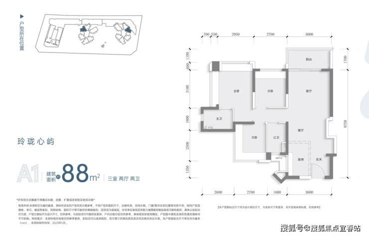 建面约88㎡三房两卫户型:打造约3.6m舒适宽厅;主卧套间双飘窗设计,次卧尺寸及方正度提升,两面凸窗满足2*1.2m床布置。
