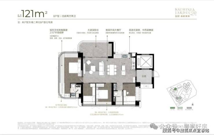 121m²四房两厅两卫的B户型:采用横厅南北通透格局,得房率约92-100%(含赠送),阳台主要朝向西南或东南。