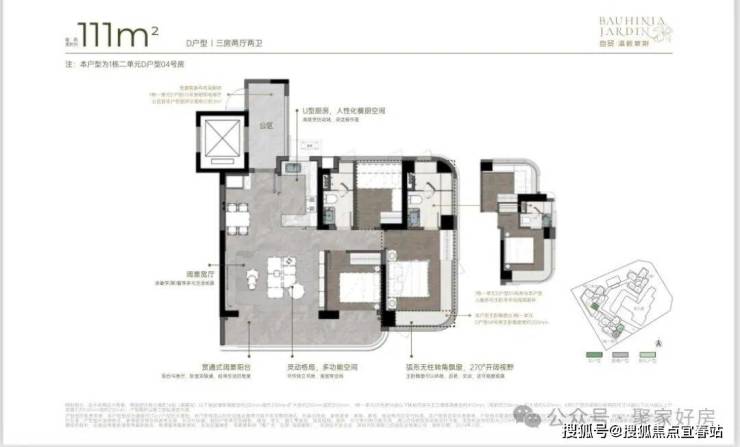111m²三房两厅两卫的D户型:竖厅格局,得房率约92-100%(含赠送),朝向为西南或东南。