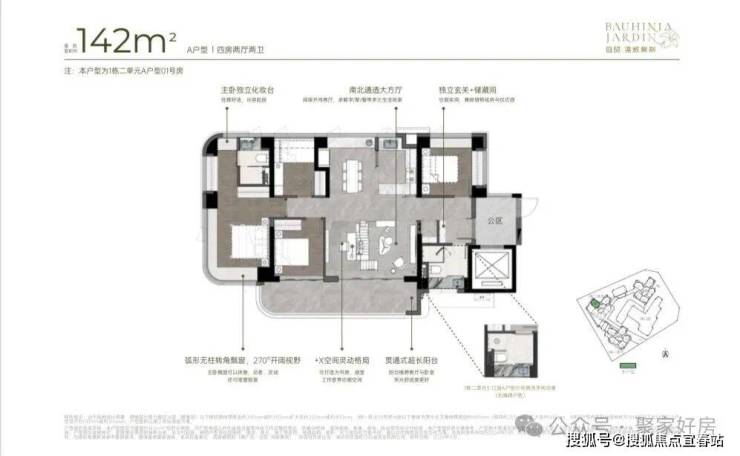 142m²四房两厅两卫的A户型:双龙抱珠户型,得房率约92-100%(含赠送),朝向为西南或东南。
