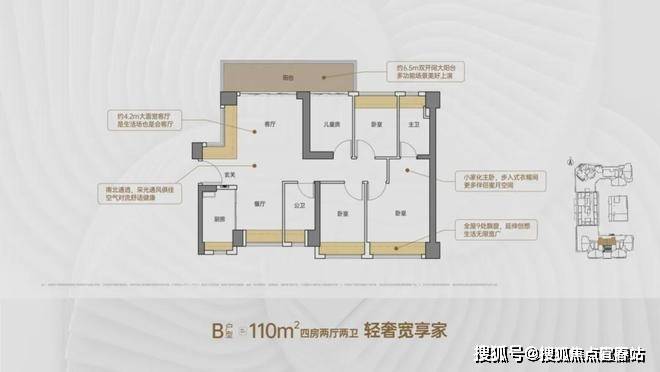进门户玄关,客餐厅6.5米开间,LDKB一体化,客厅连接次卧出6.1米长的大阳台,主卧大套间设计,全屋8处飘窗,U型厨房,卫生间干湿分离。