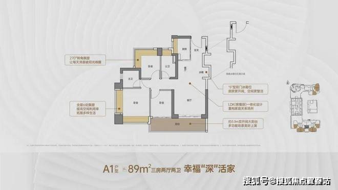 竖厅格局,客厅3.5米开间,LDKB一体化,S墙设计预留冰箱卡槽位,客厅连接次卧出5.9米长的大阳台,主卧双面飘窗,次卧270°转角飘窗,全屋6面飘窗,U型厨房,卫生间干湿分离。
