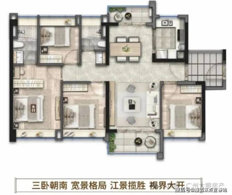 南北双阳台对流,江景尽收眼底,四开间朝南,三卧室南向瞰江