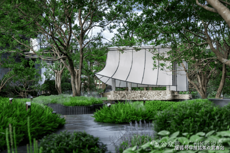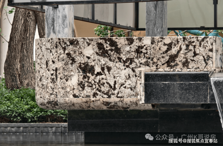 茶室底座,用的是巴西进口的雪山银狐奢石。这类奢石,因为独特的透光性,一般用于顶豪室内装饰,如今却被保利大胆用在园林公区,奢华程度可见一斑。