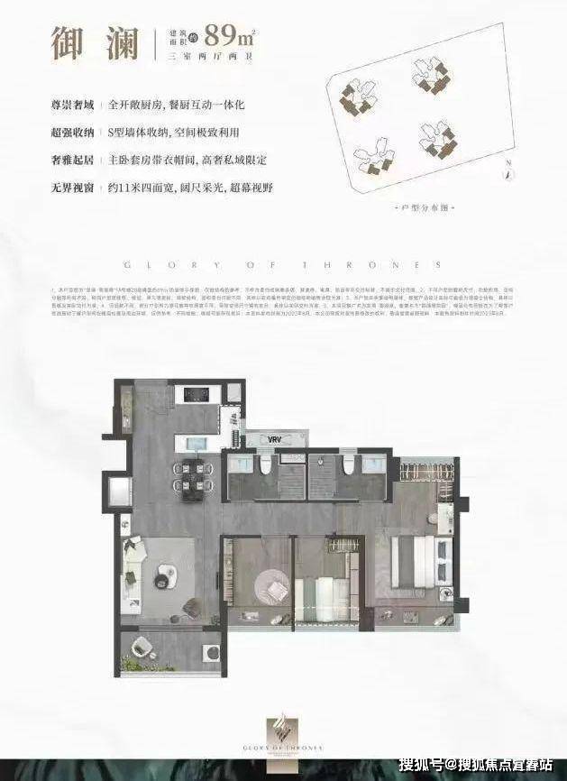 设计的是横厅南北通透格局,客餐厅开间8米,约14.7米超幕视野,超长阳台,主卧转角270°大飘窗,U型厨房,得房率:78.99%(不含赠送),阳台主朝西南或东南向。