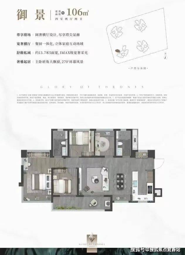 设计的是横厅南北通透格局,客餐厅开间5.6米,餐厨一体化,约13.7米超幕视野,超长阳台,主卧转角270°大飘窗,只有2栋07户型才有,得房率:78.99%(不含赠送),阳台主朝西南向。