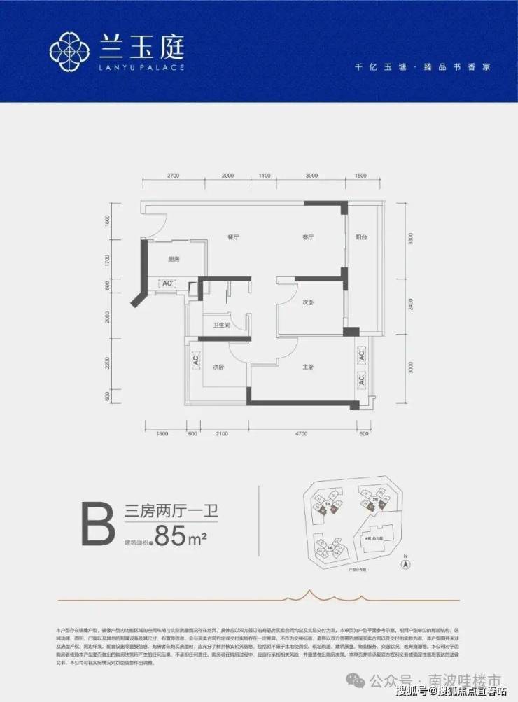 85㎡的3房2厅1卫,B户型,设计的是竖厅格局,客厅开间3.3米,LDKB一体化,三开间朝南,3个卧室分别做到了3米/2.7米/2.4米的宽度,客厅连接次卧出5.7米长的大阳台,L型厨房,创新式三分离卫生间,得房率约79%(不含赠送),西南或东南朝向。