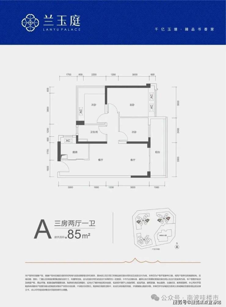85㎡的3房2厅1卫,A户型,设计的是竖厅格局,客厅开间3.3米,LDKB一体化,三开间朝南,3个卧室分别做到了3米/2.8米/2.4米的宽度,客厅连接次卧出5.7米长的大阳台,L型厨房,得房率约79%(不含赠送),西南或东南朝向。